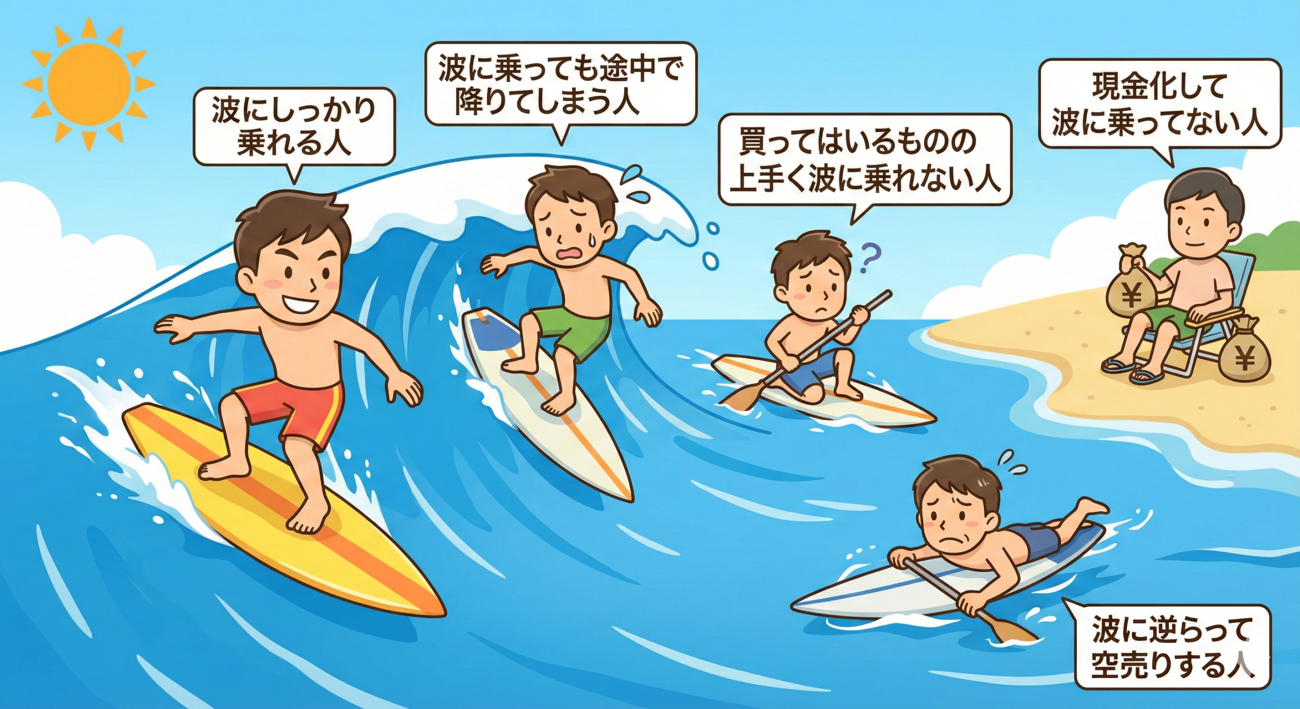 ある程度の余裕資金を持つ30代、40代の投資家にとって、最適な戦略は波にしっかり乗れる人を目指すことである。